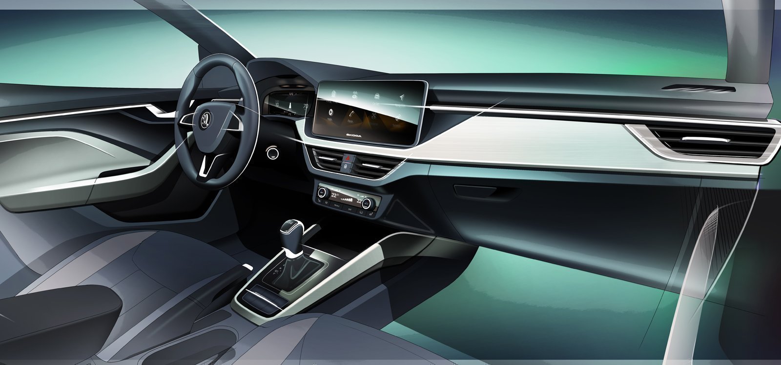Σύμφωνα με τους Τσέχους το αυτοκίνητο θα εφοδιάζεται με σύγχρονη τεχνολογία, θα έχει χώρου και η σχεδιαστική του φιλοσοφία θα ακολουθεί την εποχή. Εσωτερικά και όπως θα δείτε από την φωτογραφία που κυκλοφορεί διακρίνεται ο ψηφιακός πίνακας οργάνων (Virtual Cockpit) 10,25 ιντσών που θα διαθέτει πέντε διαφορετικά προφίλ ενώ θα υπάρχει και μία οθόνη αφής 9,2 ιντσών του συστήματος πολυμέσων στην κεντρική κονσόλα.