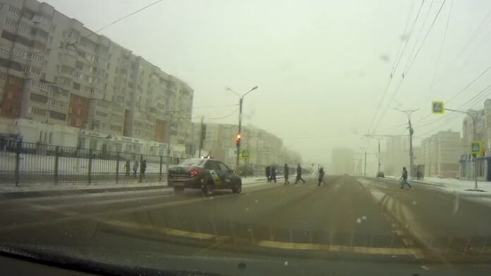 Ο δρόμος είναι ολισθηρός λόγω της χιονόπτωσης. Οι οδηγοί κινούνται με χαμηλές ταχύτητες και οι πεζοί περνούν προσεκτικά τον δρόμο, χρησιμοποιώντας τη διαγραμμισμένη διάβαση, καθώς το πράσινο ανθρωπάκι στον φωτεινό σηματοδότη είναι αναμμένο.