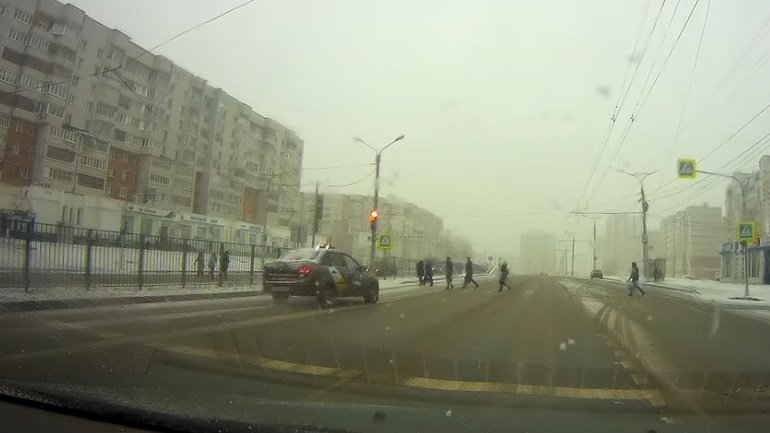 Ξαφνικά εμφανίζεται με μεγάλη ταχύτητα ένα ταξί. Ο οδηγός παραβιάζει το κόκκινο φανάρι και κατευθύνεται προς τους πεζούς. Ως εκ θαύματος, το όχημα περνά ανάμεσά τους χωρίς να ακουμπήσει κανέναν.