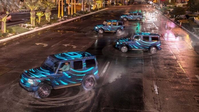 Στο Las Vegas όπου λαμβάνει χώρα αυτή τη περίοδο η έκθεση τεχνολογίας CES, η Mercedes έβαλε στην κεντρική λεωφόρο 4 προπαραγωγής μοντέλα EQG, τα οποία πραγματοποίησαν με τέλειο συγχρονισμό, παράλληλες επιτόπιες περιστροφές 360 μοιρών.
