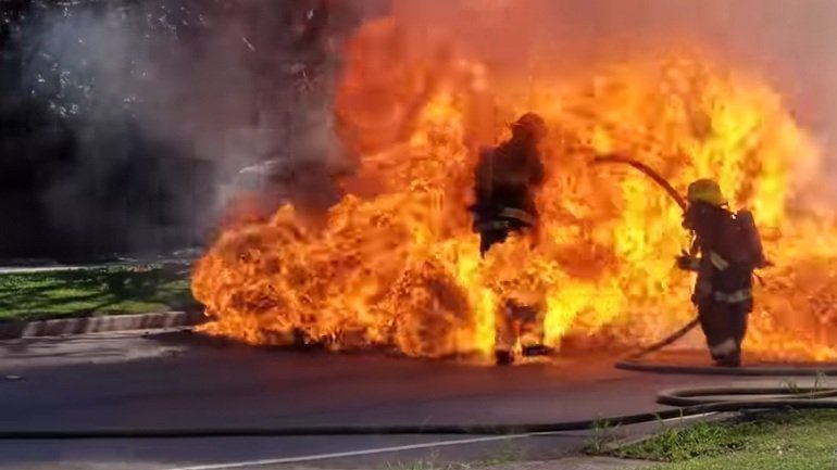 Το πρώτο πυροσβεστικό όχημα έφθασε έπειτα από λίγα λεπτά. Δύο πυροσβέστες επιχείρησαν να κατασβήσουν τη φωτιά, αλλά τα πράγματα δεν εξελίχθησαν όπως τα υπολόγιζαν. Τη στιγμή που πλησίασαν το SUV, ανατινάχθηκε το ντεπόζιτο και οι φλόγες τούς κάλυψαν πλήρως.